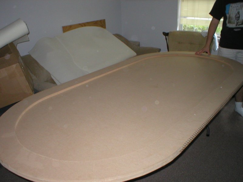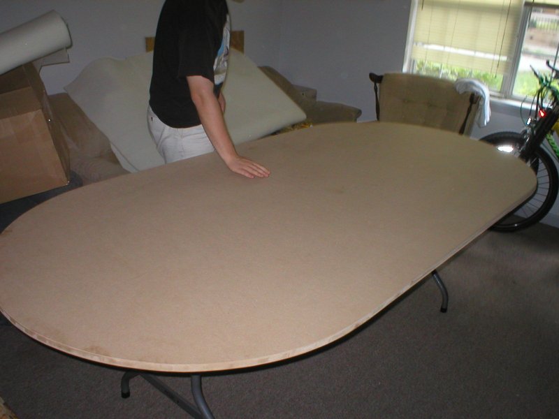This is the cut table top attached to the folding table. Cut out of a single sheet of 4x8 MDF.